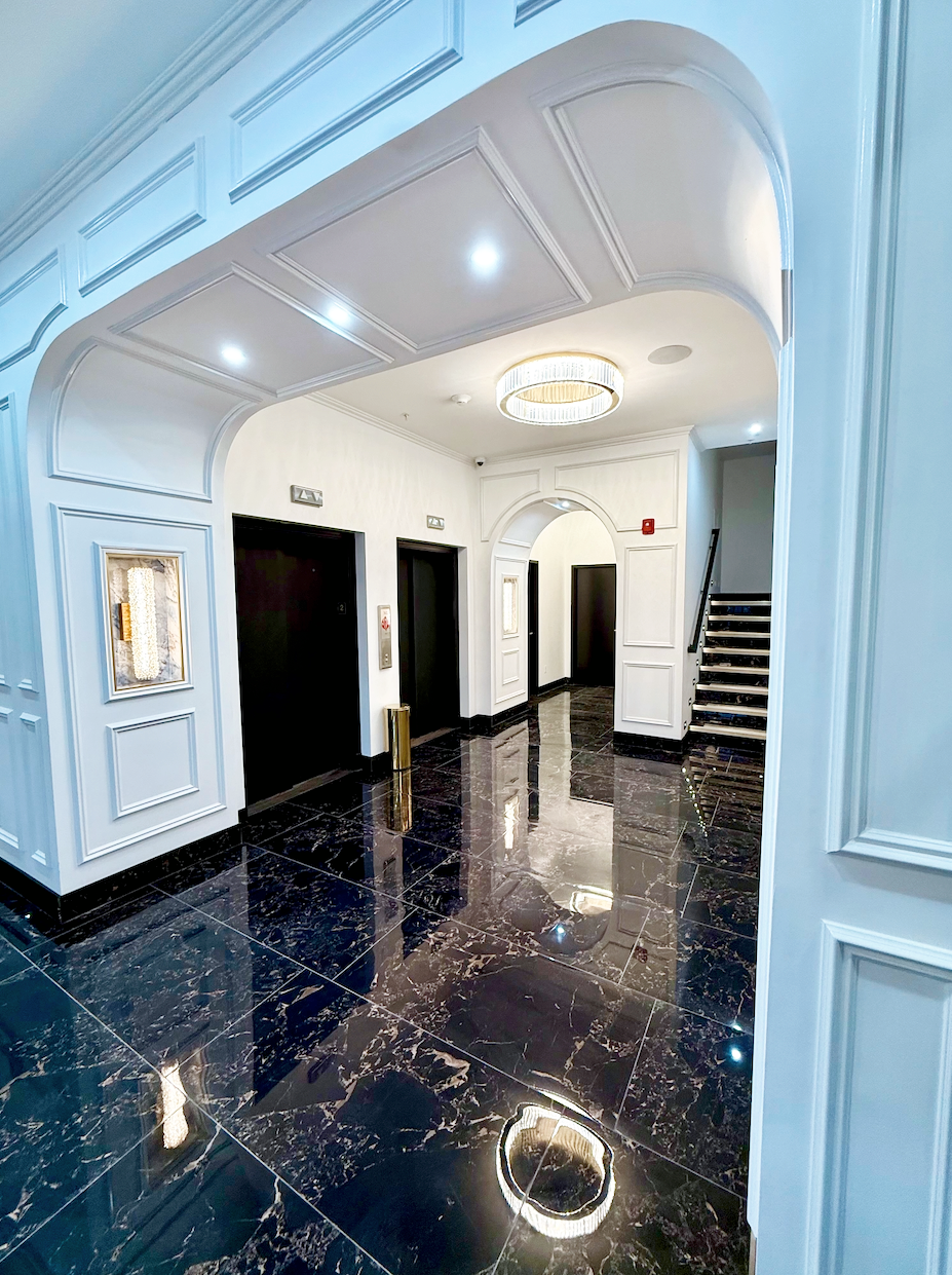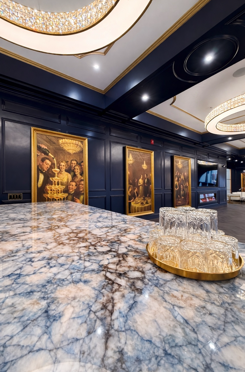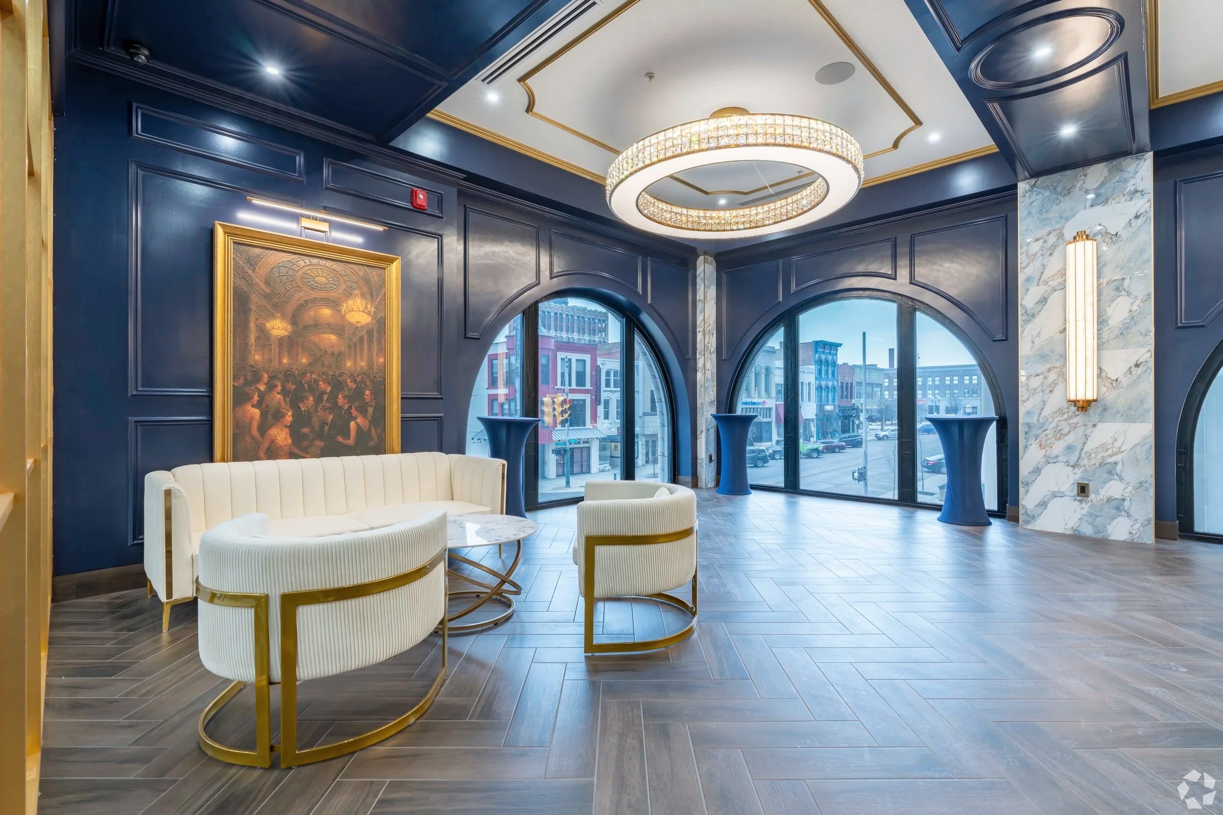 The Champagne Room at 28N is a one-of-a-kind, 1,300-square-foot private event venue inspired by the elegance of the 1920s and elevated with modern luxury. Rich wood-paneled walls and ceilings, marble columns, custom chandeliers, and dramatic alabaster sconces create a warm, unforgettable atmosphere, while 14-foot ceilings and 12-foot arched windows overlooking downtown Pontiac give the space both scale and presence.