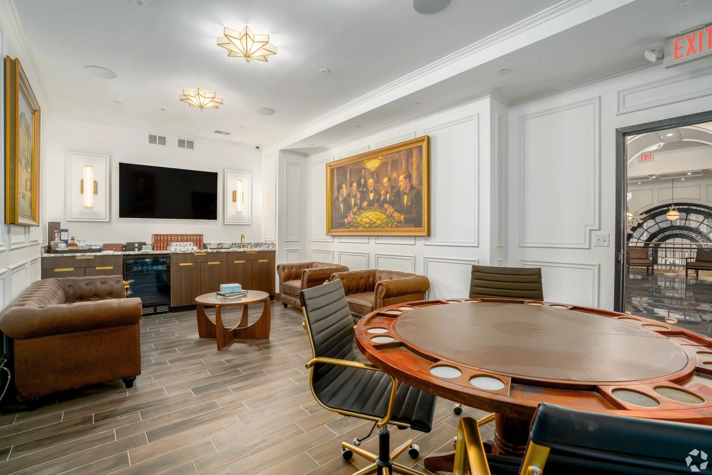 A 1920s-inspired lounge featuring a poker table, couches, and a wet bar. Perfect for VIP use, private gatherings, or a more intimate companion space to a larger event.Large Conference Room (Up to 18 Guests)